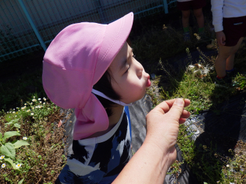 息を吹くと綿毛が飛ぶことにビックリ!!体験したことが嬉しくて何度もみんなで試していましたfrown