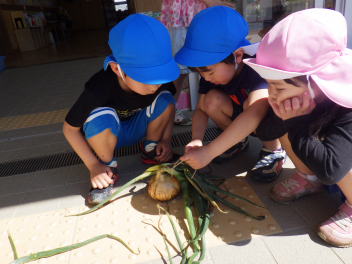 玉ねぎの茎が倒れてきて、土から顔を出している玉ねぎを見て『もう玉ねぎとってもいいかな・・』となったぞう組のこどもたちsad玉ねぎの絵本を見て茎が倒れたらとってもいいサインと知り、玉ねぎ収穫が始まりましたwink