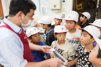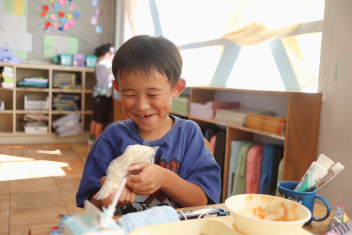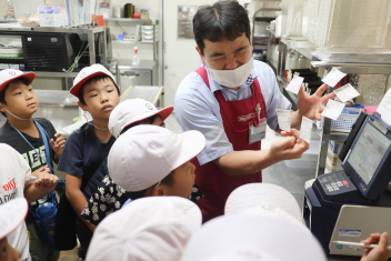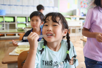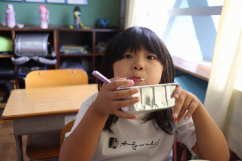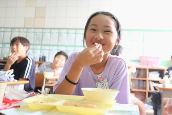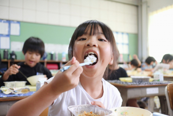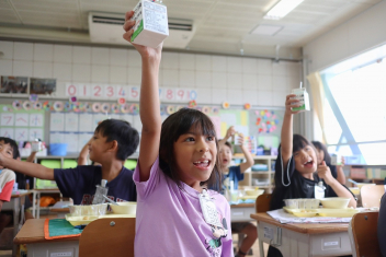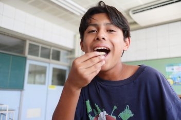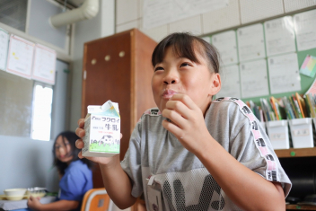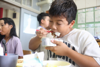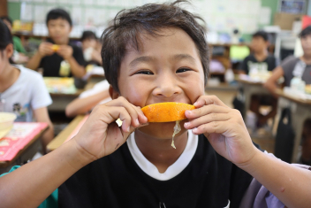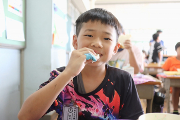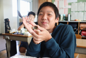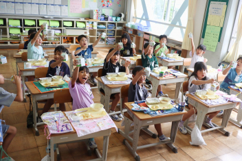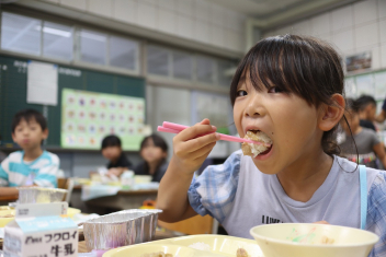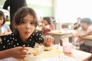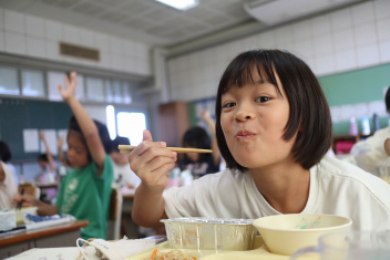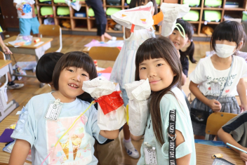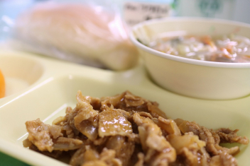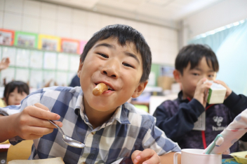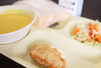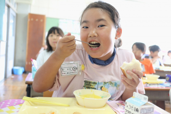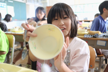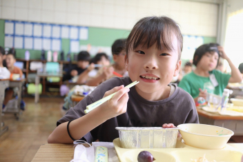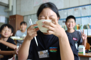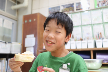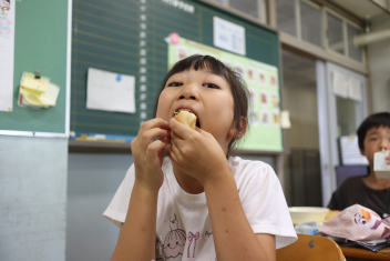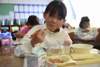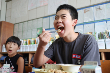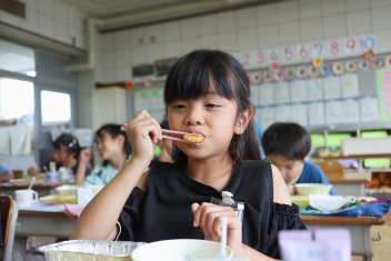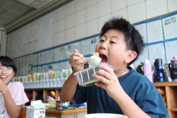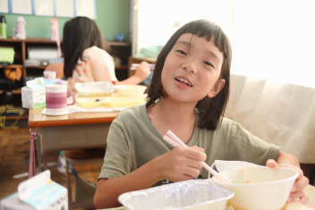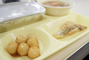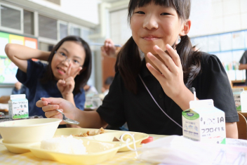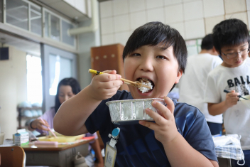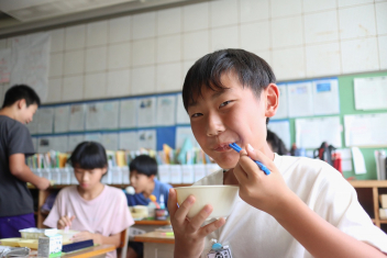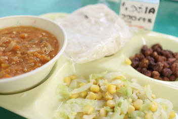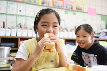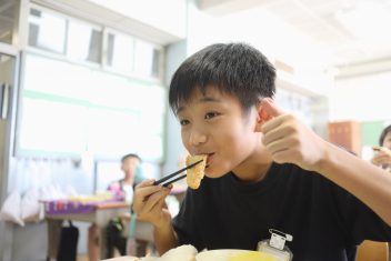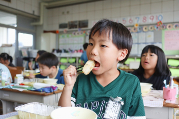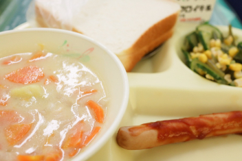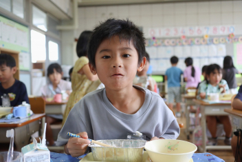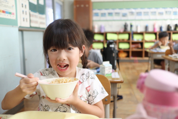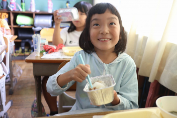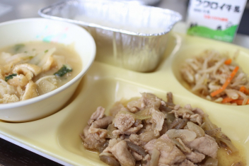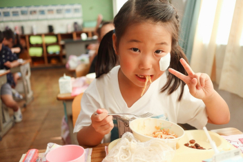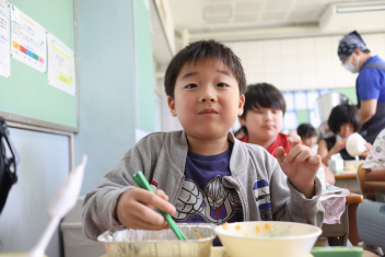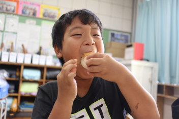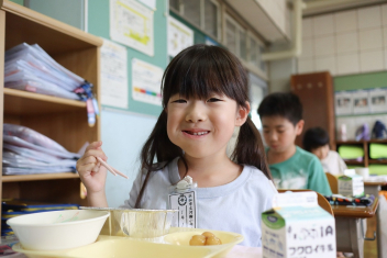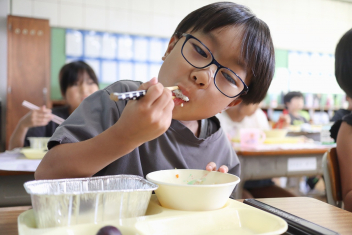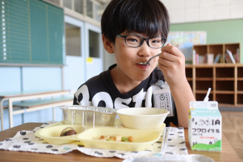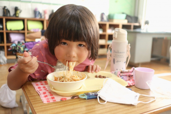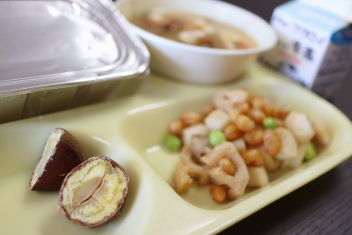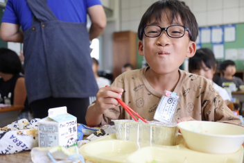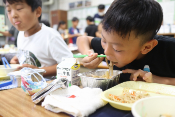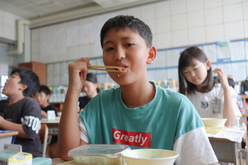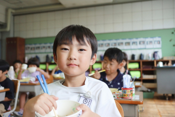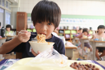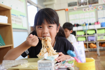 今日の給食はソフトめんでした。1年生も自分で袋を開けられるようになってきました。副菜のココア豆がおいしかったですね!