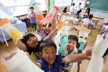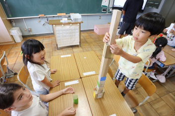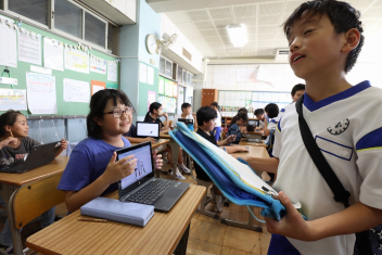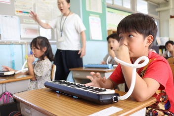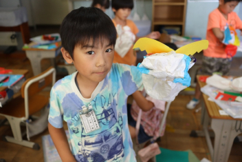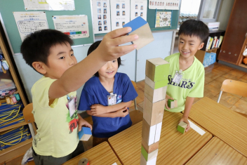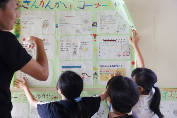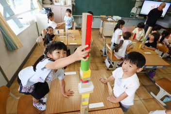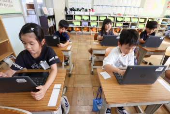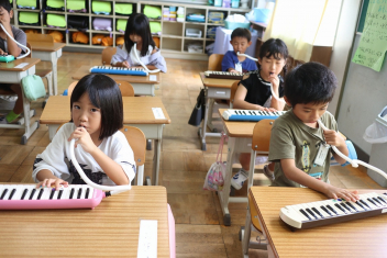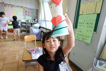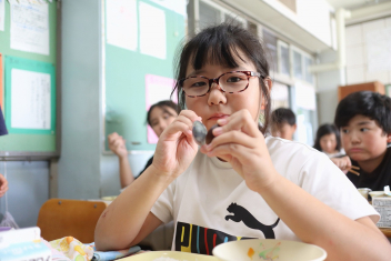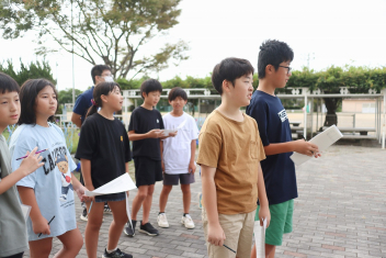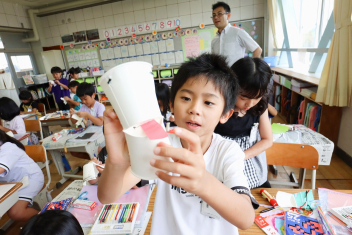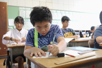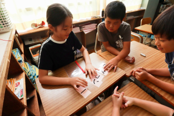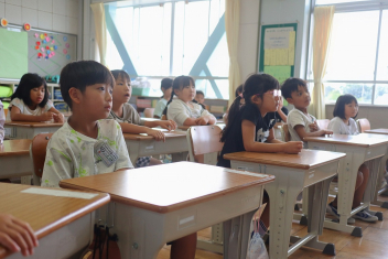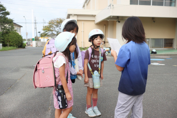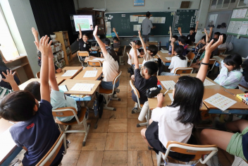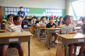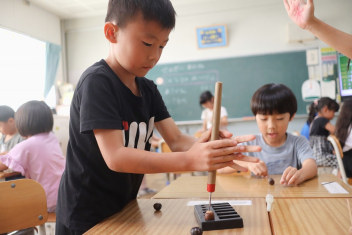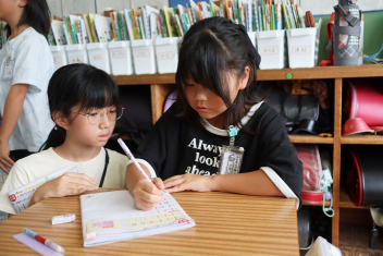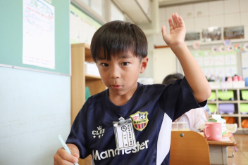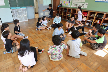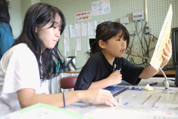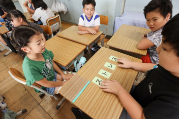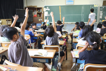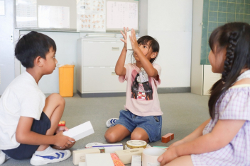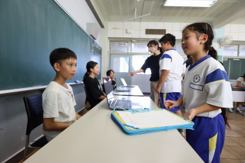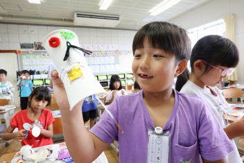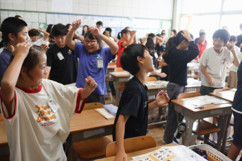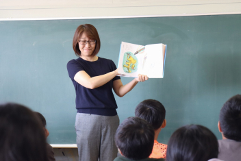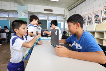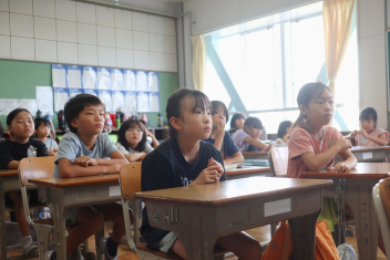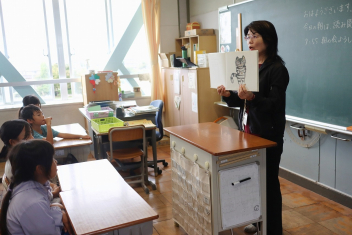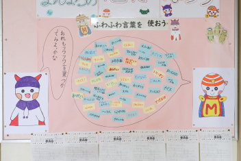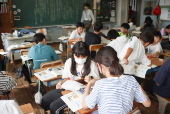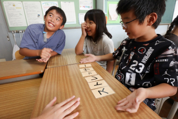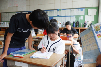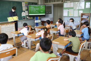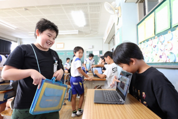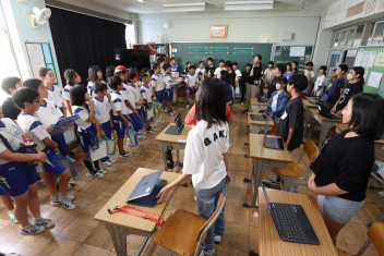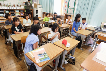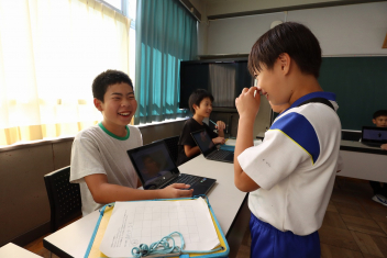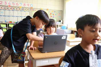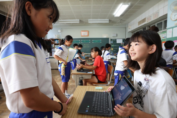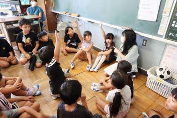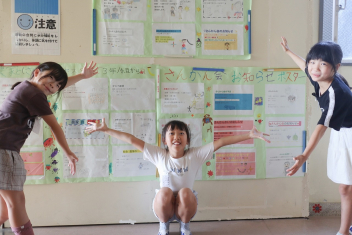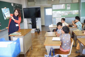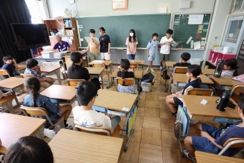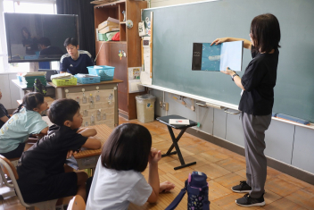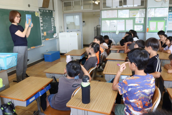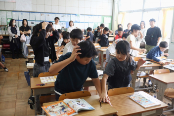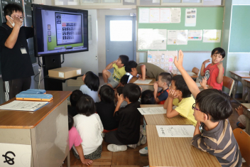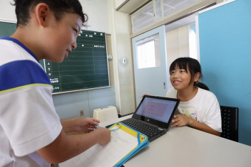 5年生が外国語の時間に4年生を招待して英語のクイズをしました。タブレットを使って3ヒントクイズの形式のスライドを作っていました。楽しく交流できましたね。