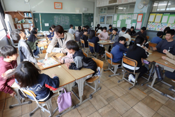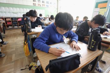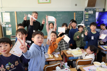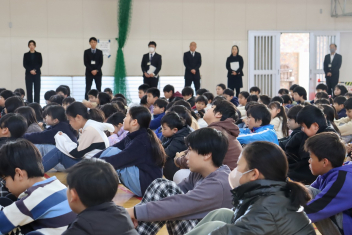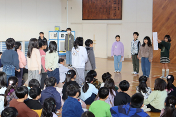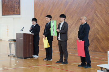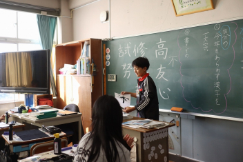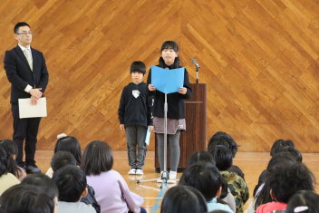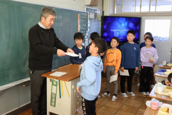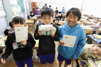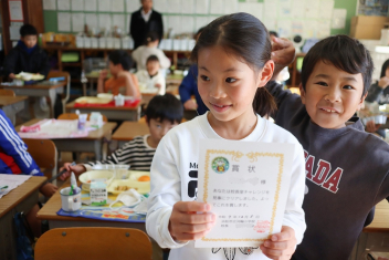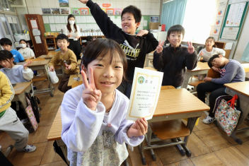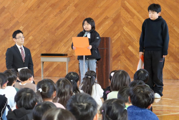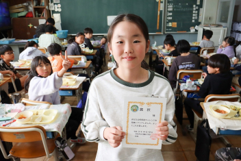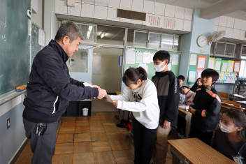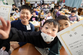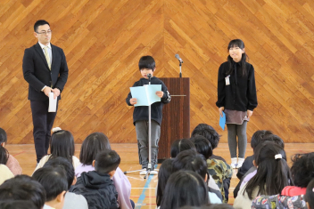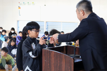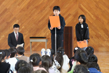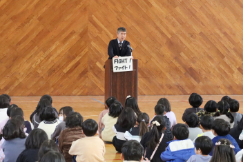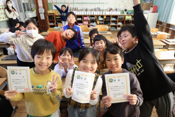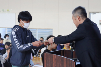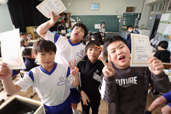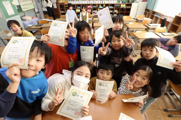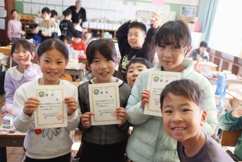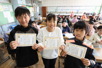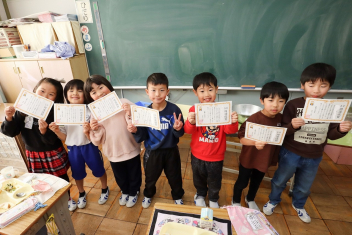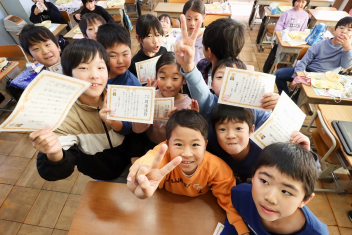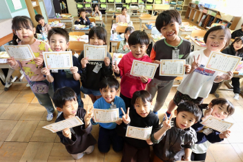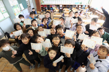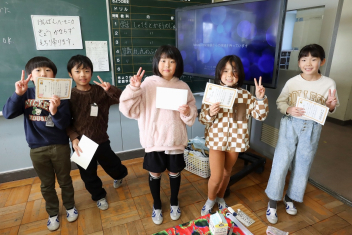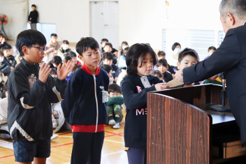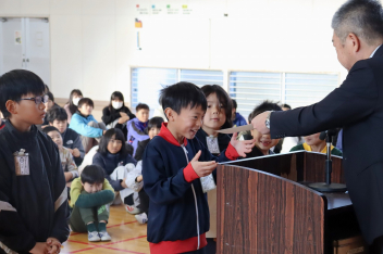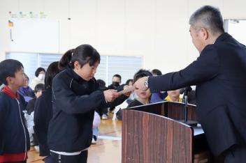 持久走記録会に向けての自主練習で、低学年50周、中学年75周、高学年100周の目標を達成した子たちに賞状を渡しました。みなさん、よく頑張りましたね。