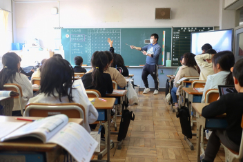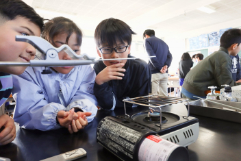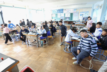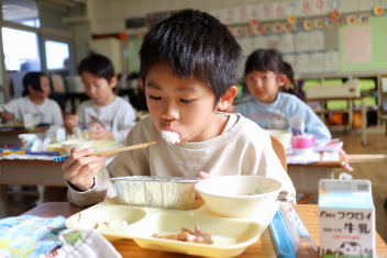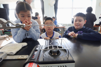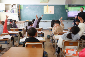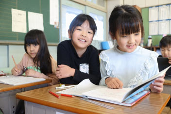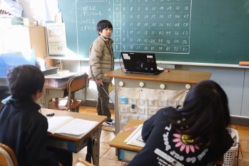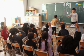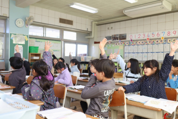 3年生の算数の授業です。特に先生は指示していませんでしたが、わからない友達にそっと教えたり、友達の発表に相づちを打ったりして温かな雰囲気で取り組んでいました。