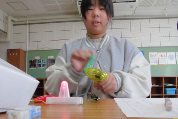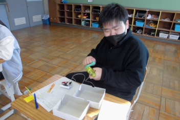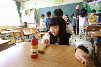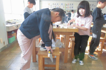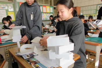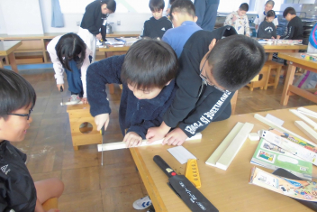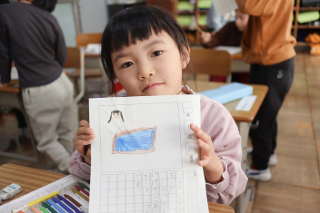 2年生が図工の授業をしていました。小さなお家の設計図をかいているようです。「ここはベッド、ここは階段で…」と思いが次々に浮かんでくるようで、図面を見せながらたくさんお話してくれました。