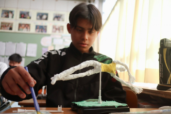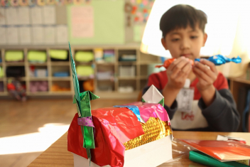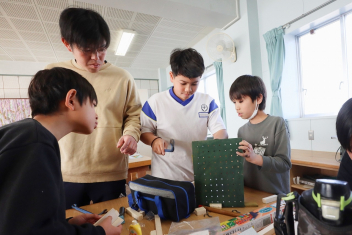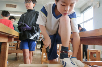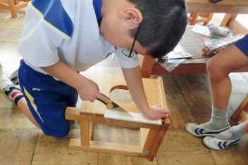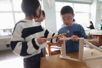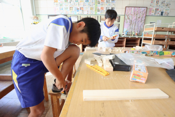 4年生の図工の学習です。のこぎりや金づちを使ってダイナミックな作品をつくっていました。