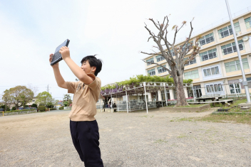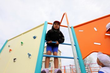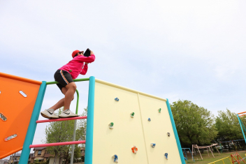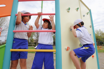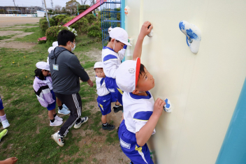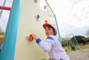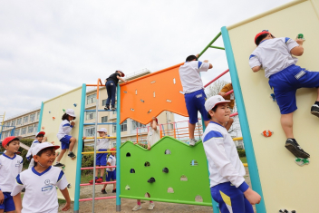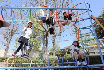 2時間目に体育があった2年1組が一番乗りで使っていました。見るとひょいひょいと登れそうですが、手の力だけでなくバランスが必要なようです。遊びながら体力をつけられそうですね。のびのびタイムや昼休みにはたくさんの子供たちが遊んでいました。