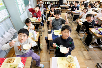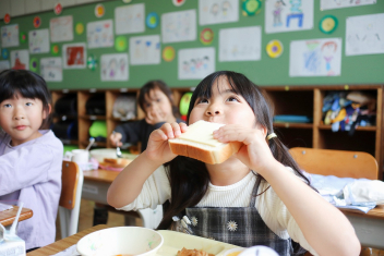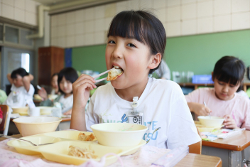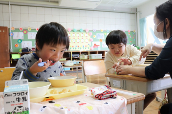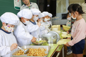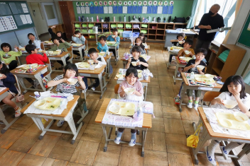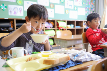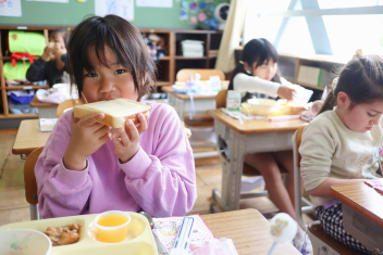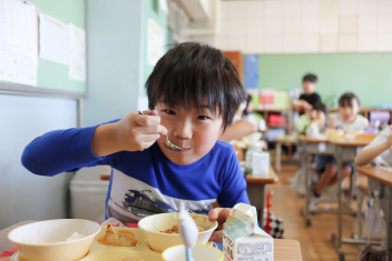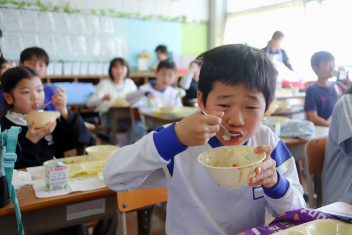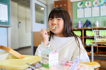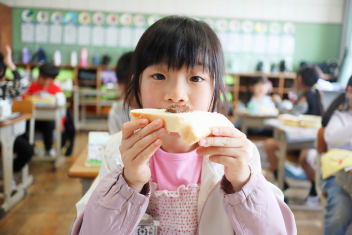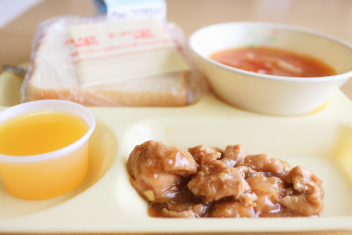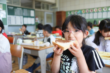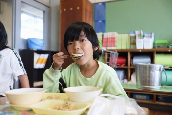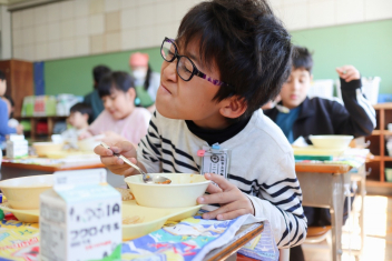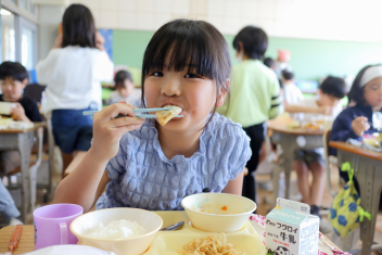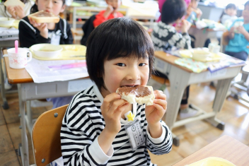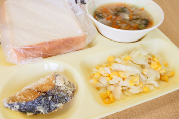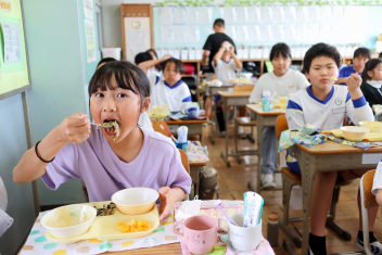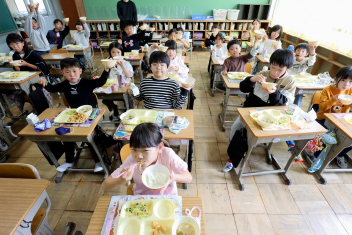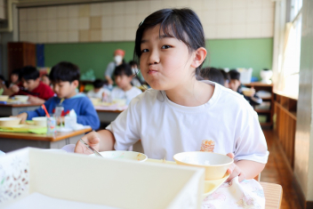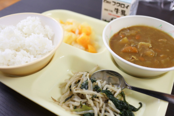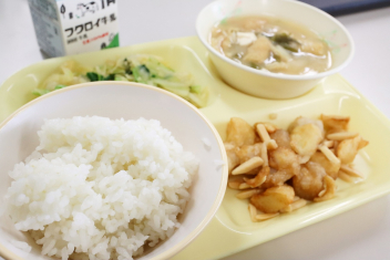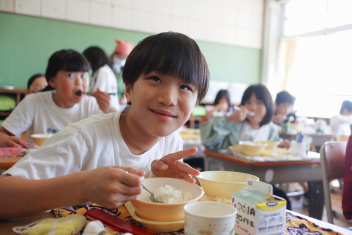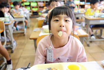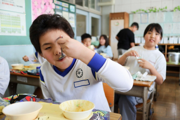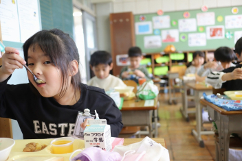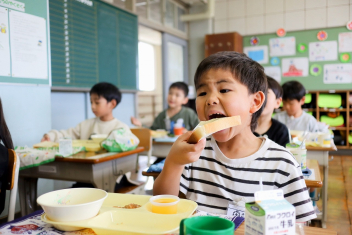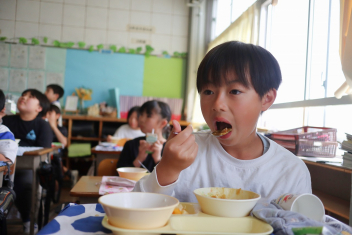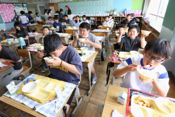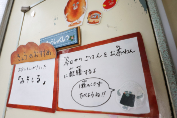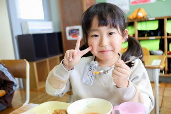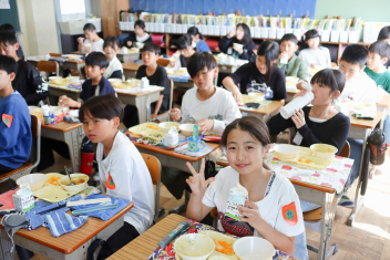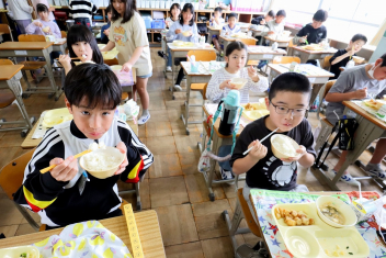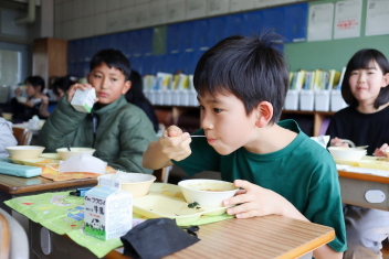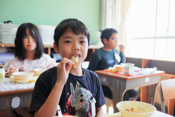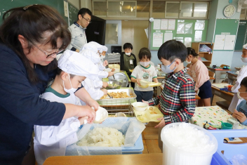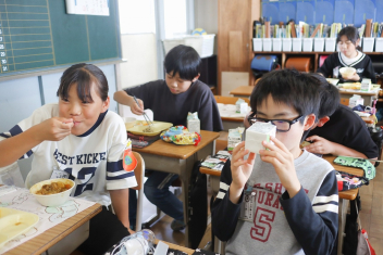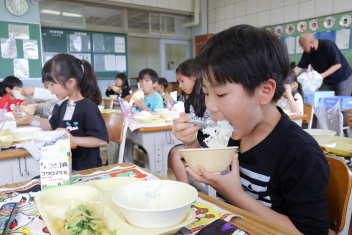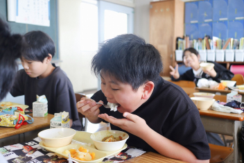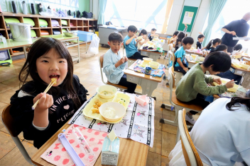 大人も子供もお待ちかねの給食が始まりました。1年生にとっては初めての学校給食でした。とても上手に配膳できていました。今年からごはんがアルミパックではなくお茶碗で食べることになります。子供たちには好評のようでした。