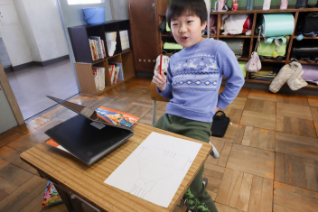 2年生が図工の授業をしていました。小さなお家の設計図をかいているようです。「ここはベッド、ここは階段で…」と思いが次々に浮かんでくるようで、図面を見せながらたくさんお話してくれました。