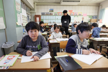 3年生の算数の授業です。特に先生は指示していませんでしたが、わからない友達にそっと教えたり、友達の発表に相づちを打ったりして温かな雰囲気で取り組んでいました。