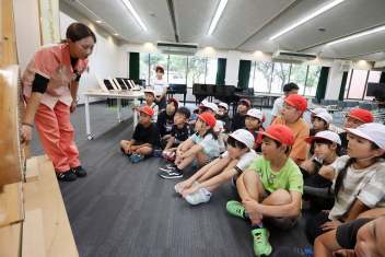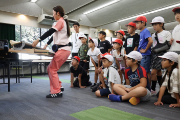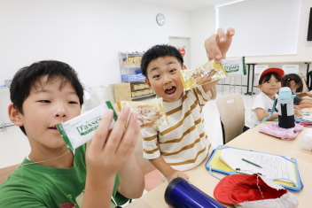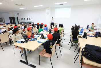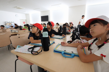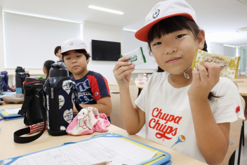 学習室で外国人指導の先生が1年生に算数の授業をしていました。いろいろな形の箱を話し合いながら仲間分けすることができましたね。3人とも頑張っていました。