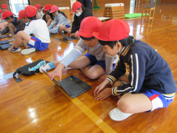 開脚跳びのコツを動画で確認し、挑戦していました。
