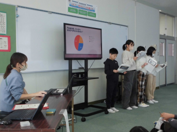 今年の学校保健委員会は、浜松市の出前講座を利用して「リフレーミング」をテーマに行いました。はじめに、保健委員会がアンケートの結果を発表しました。6年生は、自分のことをポジティブにとらえ、周囲に優しく声掛けができる子が多いことが分かりました。
