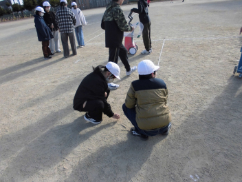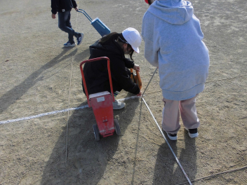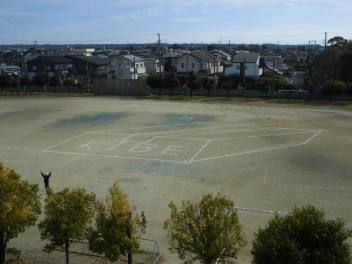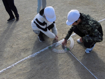 6年生は算数で拡大図と縮図の学習をしています。今日は、運動場に400倍の拡大図をかくことに挑戦しました。基の図を見ながら、角度を測り、メジャーで長さを確認しながらみんなで協力してかいていきます。大きすぎて、全体像がなかなかつかめず、試行錯誤しながらかいていました。3階のテラスから全体像を確認してもらい、アドバイスをもらいながら1時間かけて完成させました。大きな段ボール箱だそうです。