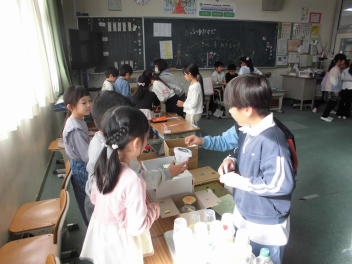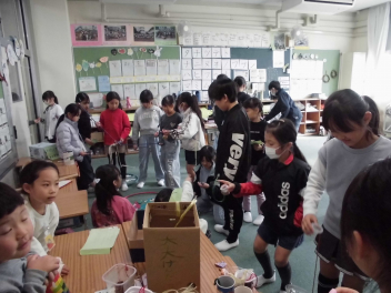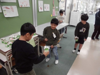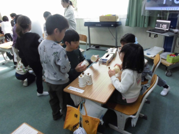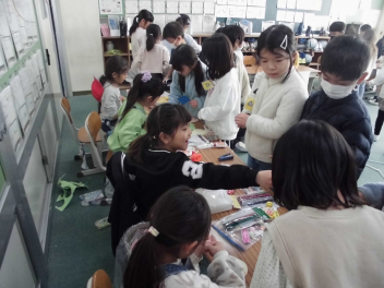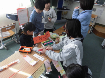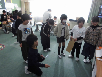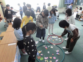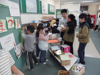 • 1年生が生活科の授業で「きべっ子あきまつり」を行いました。校庭で拾ったドングリやイチョウの葉、マツボックリのほかに空き箱や牛乳パックなどを使っておもちゃやゲームをつくり、お店屋さんを開きました。3時間目には2年生に招待状を送り、遊びに来てもらい、昼休みにはほかの学年の人たちにも楽しんでもらいました。ゲームはどれも工夫されていておもしろく、遊びにきた上級生たちはとても楽しそうでした。たくさんの人に楽しんでもらい、お祭りを開いた1年生は大満足でした。
