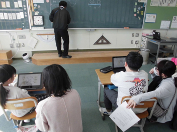 5年生の算数では、一人一人が自分の考えを打ち込んで、その考えを共有することにタブレット端末を活用していました。図形の領域では、特にタブレットが効果的に使えます。