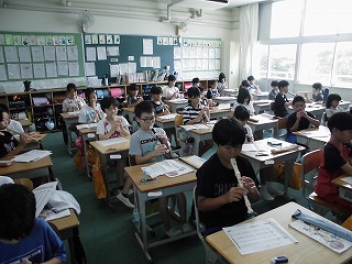 4年生の音楽です。リコーダーで合奏する練習をしていました。低い音をきれいに出すのは難しいので、指遣いや息の吹き込み方を繰り返し練習していました。