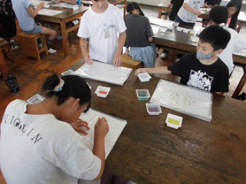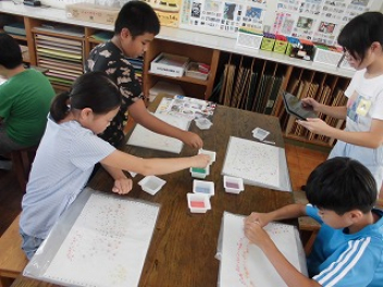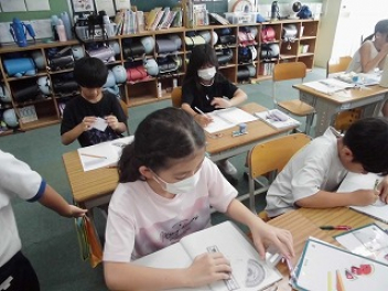 5年生の図工です。色水の水滴をたらして模様をつくっていました。写真に撮って作品として完成させます。あえて色のない水で模様を作っている子もいて、素敵な作品がたくさんありました。どの子も作品作りに集中しているようでした。
