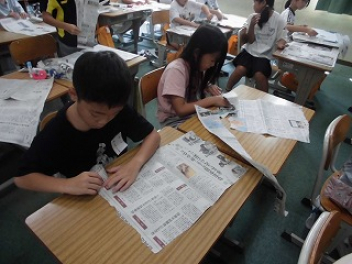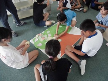 2年生の図工です。新聞をできるだけ長くちぎって材料にしようとしていました。縦にちぎるのは簡単にできましたが、横にちぎるのは指先をつかってゆっくりちぎらないとうまくいきません。苦戦している子が見られました。「ちぎる」という動作を生活の中であまりしなくなっているのかなと感じました。
