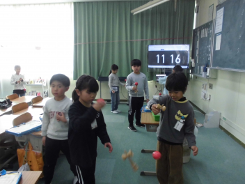 1年生が、生活科の学習で「昔の遊び」を体験しました。羽子板やかるた、こま回しやけん玉などは、日本で古くから親しまれている遊びですが、最近の子供たちにとっては、むしろ新鮮。上手にできるように何度も何度も挑戦している間に、あっという間に時間が過ぎていきました。体験後、子供たちからは「まだまだ遊びたい」という声が聞かれました。