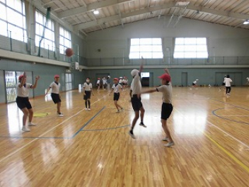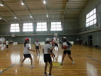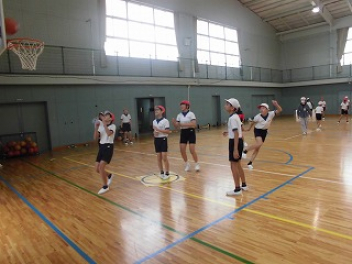 • 6年生は体育でシートバスケットボールをしています。〇のかかれたシートからのシュートは邪魔をされないルールです。ハーフコートで行われるゲームでは、シュートを目指してパスをつなぎ、1本でも多くシュートをしたい気持ちが感じられ、とても楽しそうでした。
