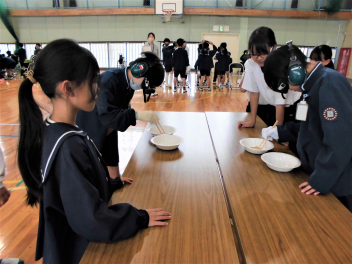 耳にイヤーマッフル、目に視野の狭くなるゴーグル、手には軍手をはめて、障がいがある場合の聞こえ方見え方、感触を体験しました。