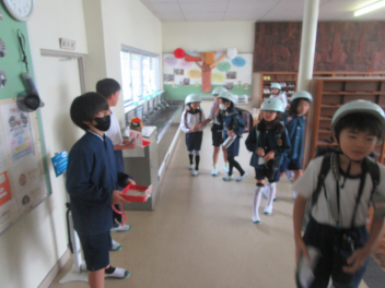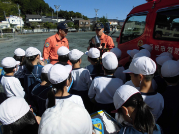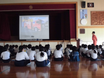 まず、体育館で消防士さんの仕事についての話を聞いたり、スライドを見たりしました。
