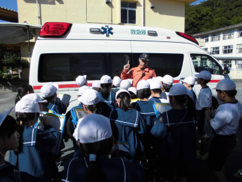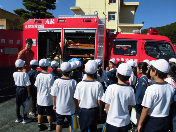 次に、実際に消防車や救急車を見ながら、装備や道具、マークの意味などを詳しく教えてくださいました。
