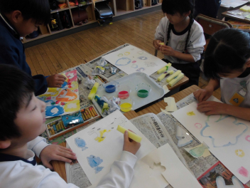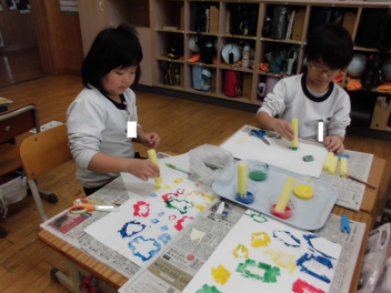 版を使って同じ形をいくつも写したり、色を変えたりして、工夫して表現することができましたsad