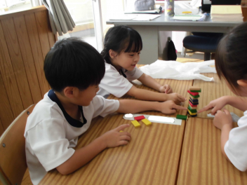今日は、たし算の導入場面で、ブロック積みをして、積み上げたブロックの数を数えました。