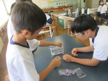 図工の授業の様子です。この時間では、ビー玉を転がすコースを作りました。道をカーブにしてみたり、アーチの飾りをつけてみたりと、工夫しながら頑張っていました。