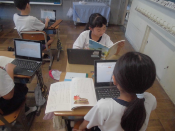 国語の授業の様子です。文章を読んで分からない言葉について紙辞書で意味を調べ、タブレットに記入することができました。