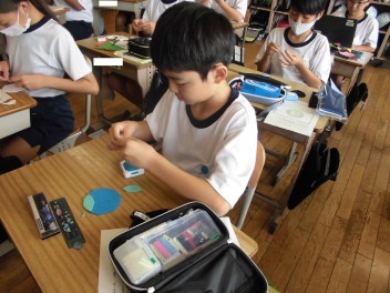 家庭科の授業では、手縫いでコースターづくりを行っています