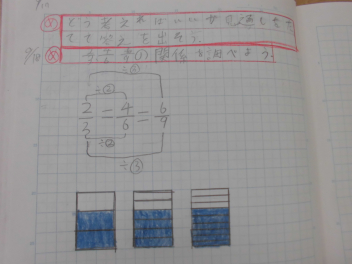 5年生算数科「分数の大きさとたし算・ひき算」では、等しい分数について説明していました。