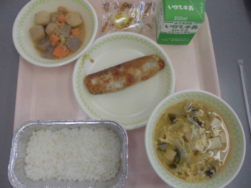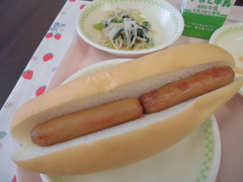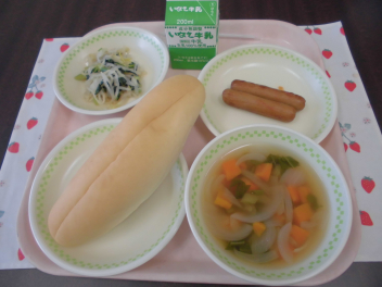 背割りロールパン、牛乳、フランクフルトのケチャップソースかけ、もやしのサラダ、青しそドレッシング、ベジタブルスープ
