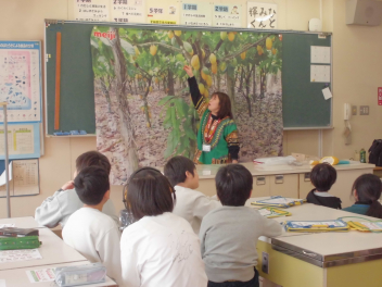 次に、校長が各学年やクラブ活動などの交流や頑張りなどを写真とともに伝えました。休み時間などに校長室でけん玉にチャレンジしていた9人の子供が、壇上でけん玉の技「大皿、小皿、中皿、ろうそく、剣、空中ブランコ、もしかめ