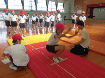 1年生は初めてのテスト種目に興味津々。2年生以上は、ルールを確認するとともに、6年生の姿にくぎ付け!