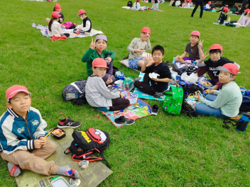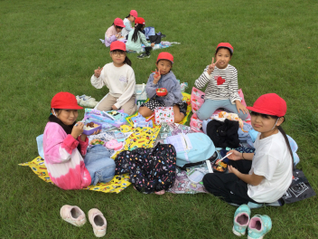 昼ご飯は、南広場でグループごとにお弁当を食べました。お家の人が持たせてくれたお弁当。
