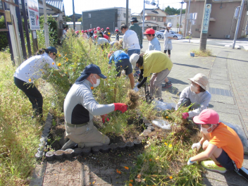 そのうちの空き地再生プロジェクトでは、地域のスクランブル交差点南側に草が生い茂った場所があったため、区役所や地域の方々に経緯を聞きながら、北浜小の6年生が手入れをしてよいかを確認しました。快く了解を得られたため、いよいよ草取りをしました。その際には、地元の自治会や健全育成会、学校応援団の皆様が協力してくださいました。「こどもとおとながつながる学校」の姿がそこにありました!