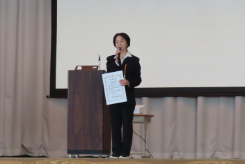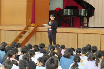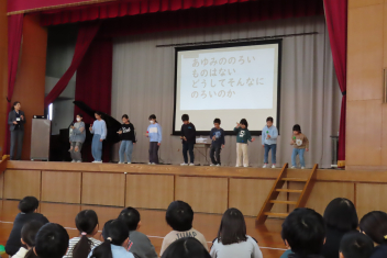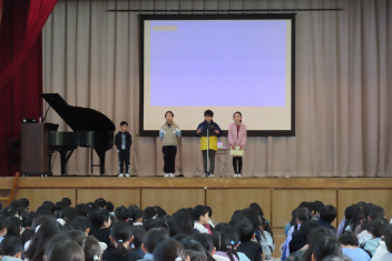 はじめに、代表児童が2学期をふりかえって発表しました。学習や係活動、自分から行動したことや挑戦したことなどをステージ上から堂々と伝えることができました。