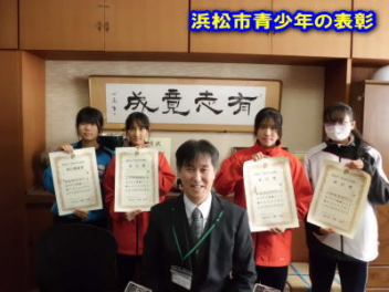 • 先週の火曜日(12/16),浜松市役所で「浜松市『青少年の表彰」』が行われました。本校の生徒が「善行賞」3人,「善行奨励賞」1人が表彰されました。この「青少年の表彰」は地域の文化活動や奉仕活動などに積極的に取り組んでいる個人・団体を賞賛しています。本校の生徒は,地域の伝統芸能である「遠州大念仏」に参加して伝統を継承しようとしたり,市民協働センターのボランティア活動に参加し静岡県教育委員会から「初級指導者」を認定されたりして表彰されました。ひとつの学校から多くの受賞者が表彰されるのは珍しいようです。本校生徒の奉仕の心が認められました。