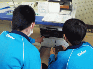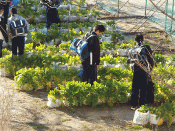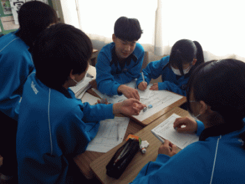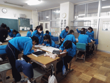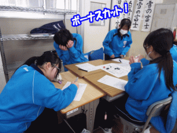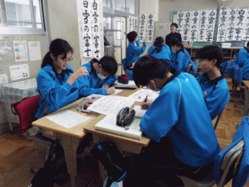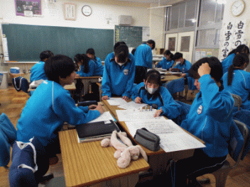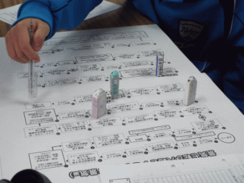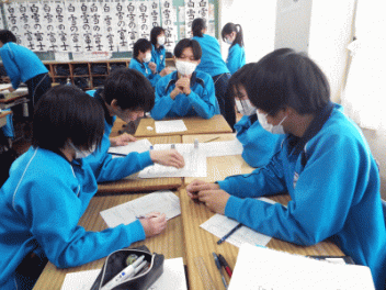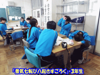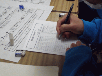 2時間目,3年生の教室から歓声が聞こえます。社会科の経済の学習で「景気七転び八起きすごろく」に取り組んでいます。このすごろくには「好景気編」と「不景気編」の2種類があるようです。サイコロを振ると「自社商品の開発に成功し売り上げ上昇,+10,000円(好景気編)」とか,「銀行からの融資がストップ 金利返済のためボーナスカット 偶数は-20,000円(不景気編)」などとマス目に記載されていて,生徒たちはサイコロの目の数を見て一喜一憂しています。生徒の手元には「収入・支出額」「給料増減額」などを記録するワークシ-トがあり,サイコロを振るたびに記入しています。最後に累計額を比べて勝ち負けを決めています。楽しく経済の言葉を学んでいます。