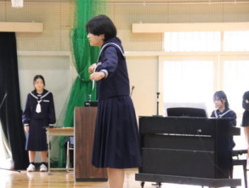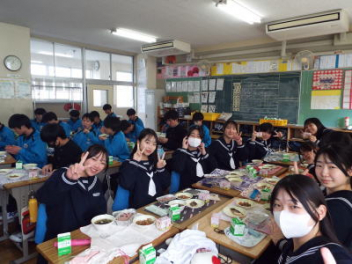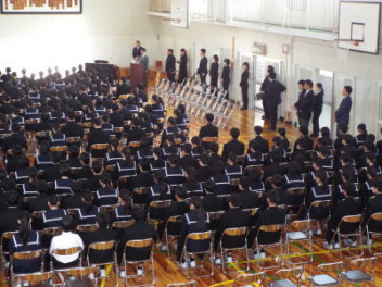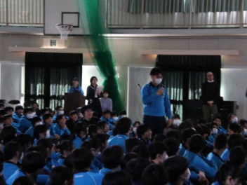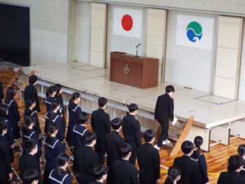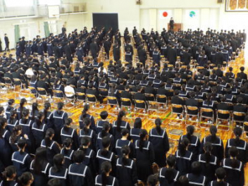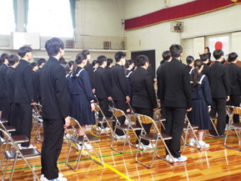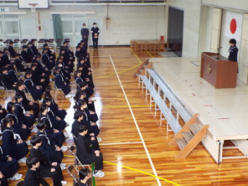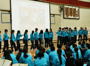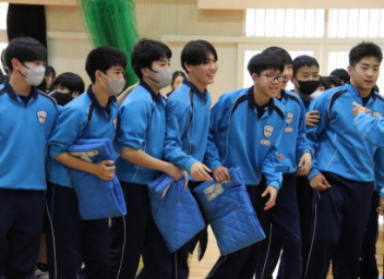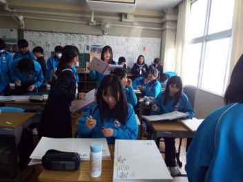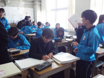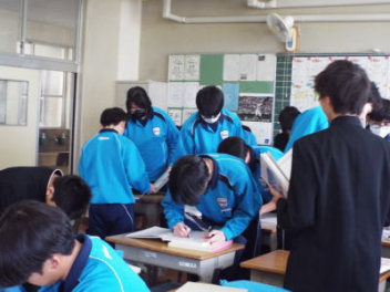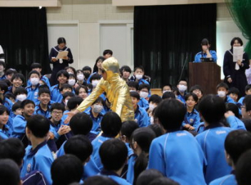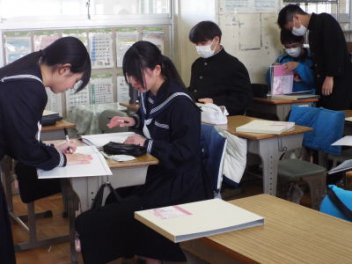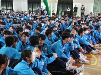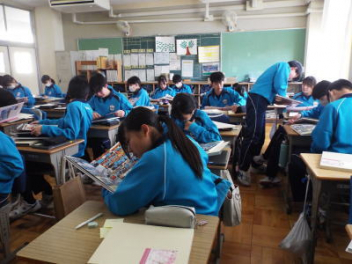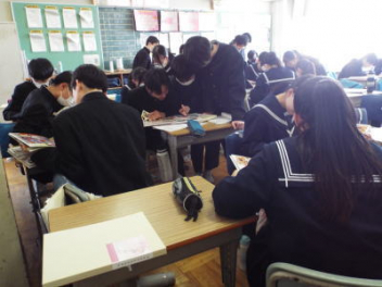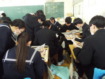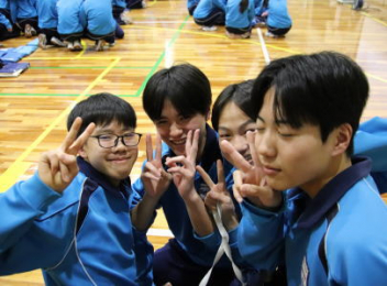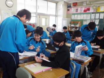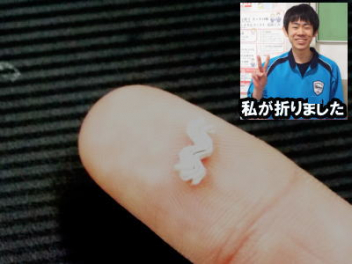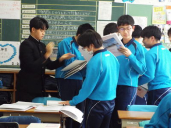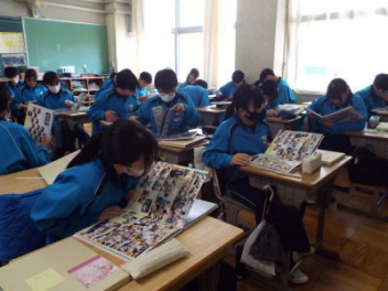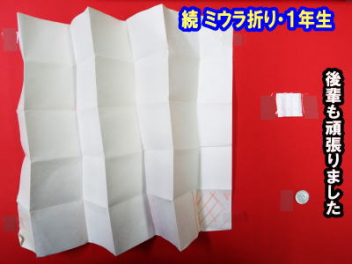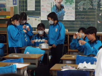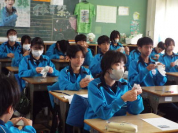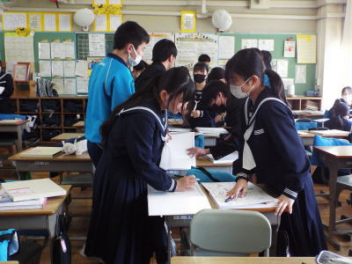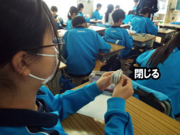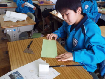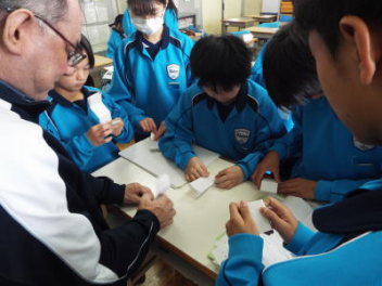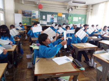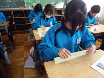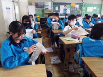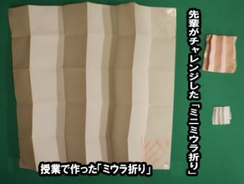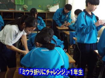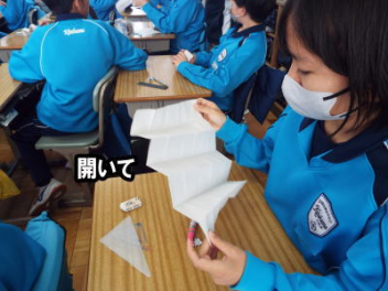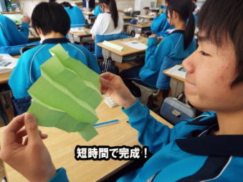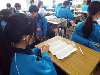 1年生が数学科の授業で「ミウラ折り」にチャレンジしています。「ミウラ折り」は,宇宙での太陽光パネルにも利用されているという,とても優れた紙の折り方です。「5等分」「縦蛇腹」「正方形ずらし折り」「横蛇腹」というように折っていくそうで,生徒たちは先生の説明を聞いたり,友達に教わりながら折りました。折りあがった紙を軽く開き,手を離すと素早く元に戻ります。最初はこの難しい折り方に苦労していましたが,1回体験すると短時間で完成するようになります。驚きの能力です。日本の「折り紙」の世界は,数学的に奥深いものであることを再確認しました。