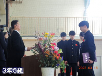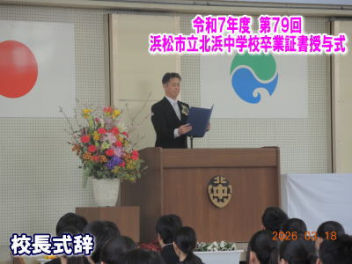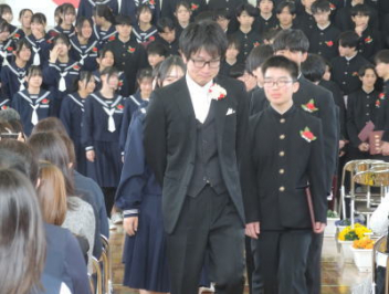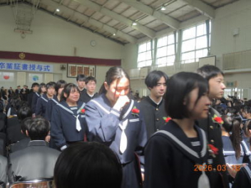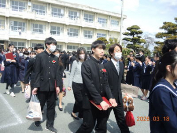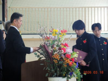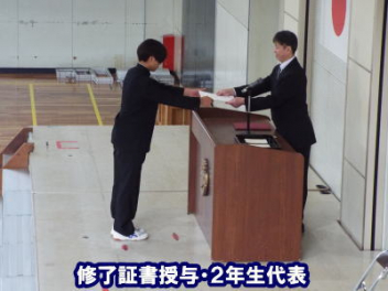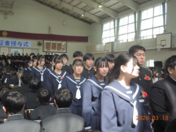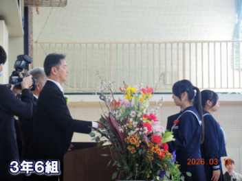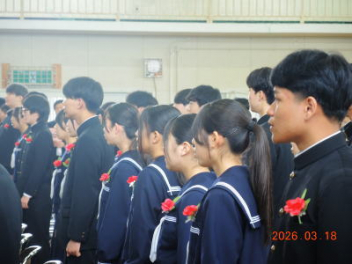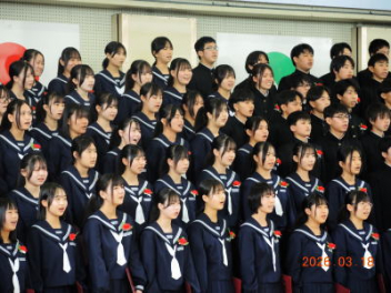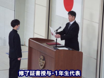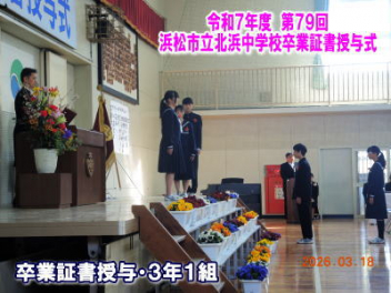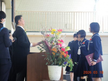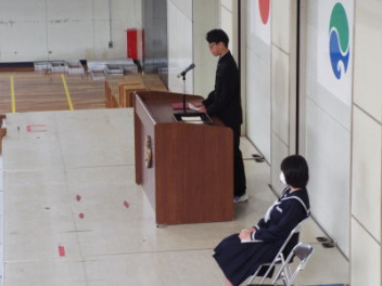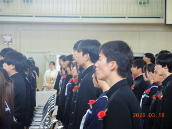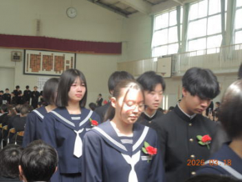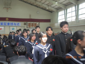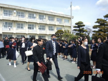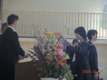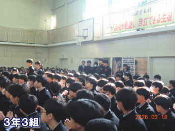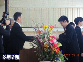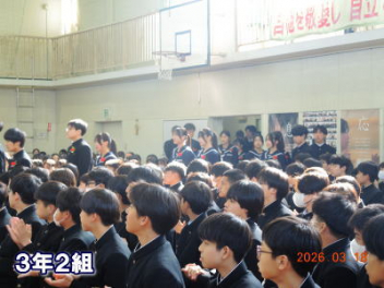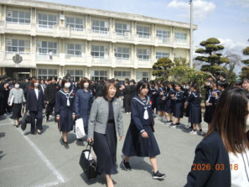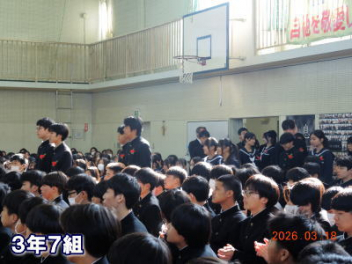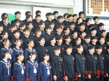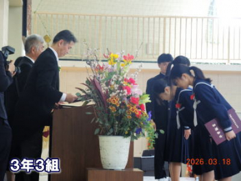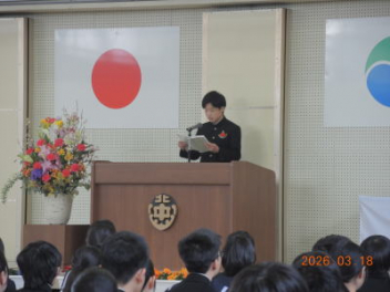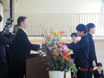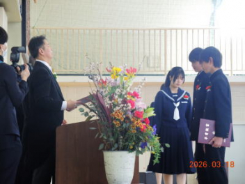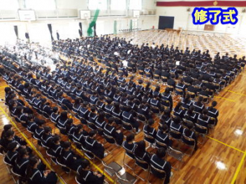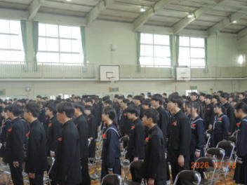 令和7年度の修了式を行いました。体育館は卒業式の式場を使っての修了式です。最初に,1・2年生の代表生徒に修了証書が授与され,続いて1・2年生代表生徒による「1年間の反省と来年度に向けての抱負」の発表がありました。久しぶりの体育館での式でしたが,2人とも落ち着いて発表しました。校長式辞では,来年度への希望が生徒たちに伝えられました。式終了後の生徒指導の話では,次への「準備」と「命」について生徒たちへ指導がありました。例年通りとはいえ,本校の各種の行事での全校生徒の真摯な姿勢に感心します。本校の式で特筆できることは,体育館への「入退場」です。特に,式が終わって退場する際には,学級委員の「気を付け,礼!」の号令で学級全体が礼をしてから動き出します。その見事な行動には見ている人も思わず気持ちを新たにします。清々しいです。