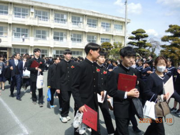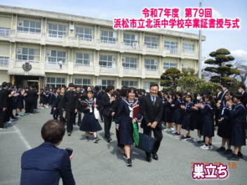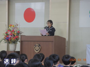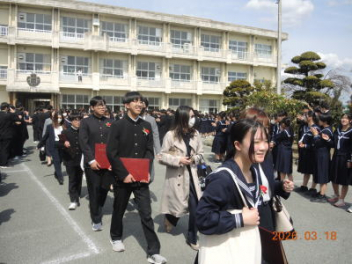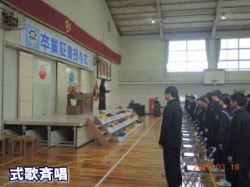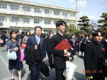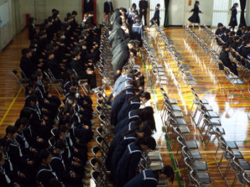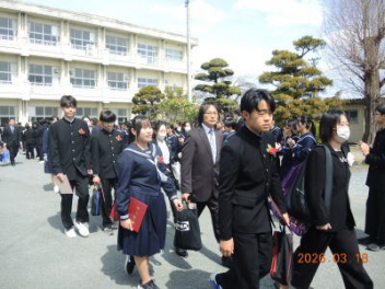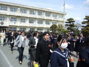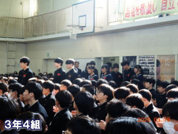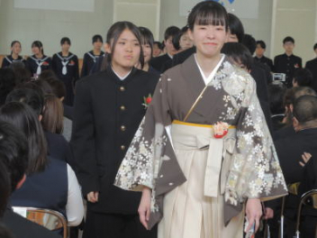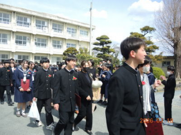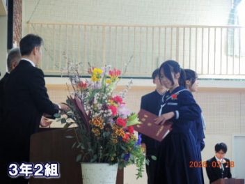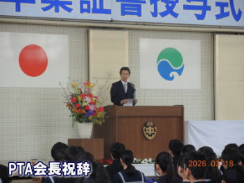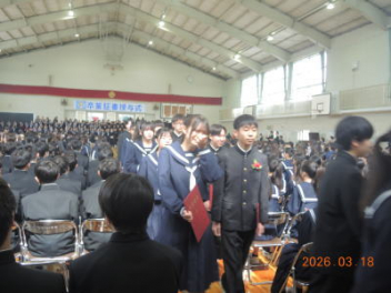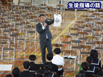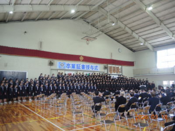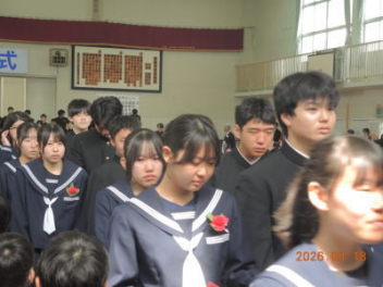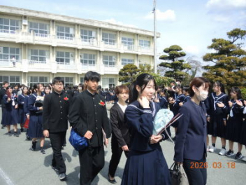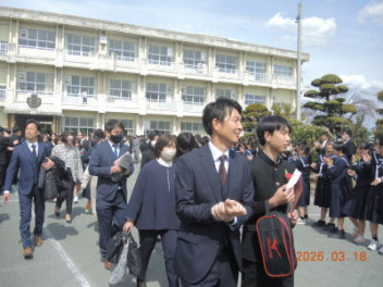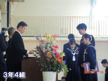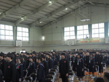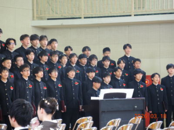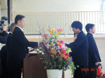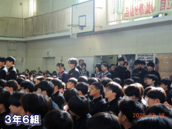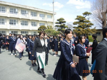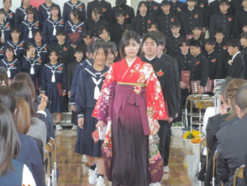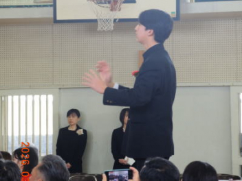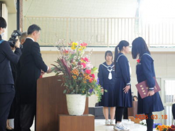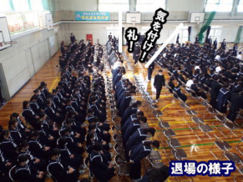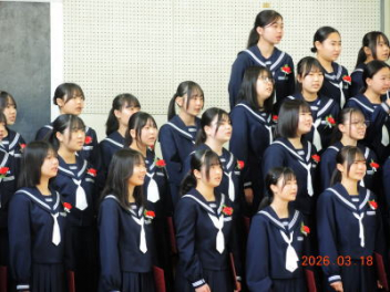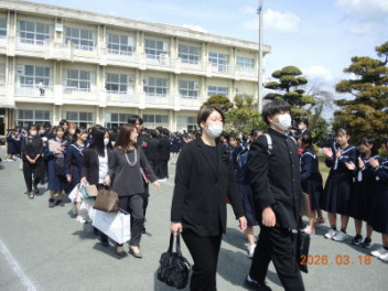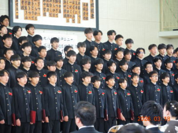令和7年度の修了式を行いました。体育館は卒業式の式場を使っての修了式です。最初に,1・2年生の代表生徒に修了証書が授与され,続いて1・2年生代表生徒による「1年間の反省と来年度に向けての抱負」の発表がありました。久しぶりの体育館での式でしたが,2人とも落ち着いて発表しました。校長式辞では,来年度への希望が生徒たちに伝えられました。式終了後の生徒指導の話では,次への「準備」と「命」について生徒たちへ指導がありました。例年通りとはいえ,本校の各種の行事での全校生徒の真摯な姿勢に感心します。本校の式で特筆できることは,体育館への「入退場」です。特に,式が終わって退場する際には,学級委員の「気を付け,礼!」の号令で学級全体が礼をしてから動き出します。その見事な行動には見ている人も思わず気持ちを新たにします。清々しいです。