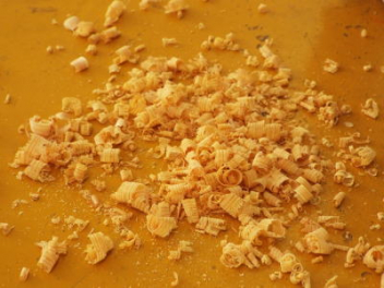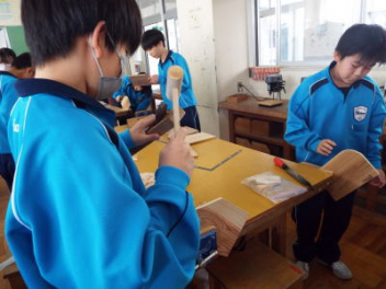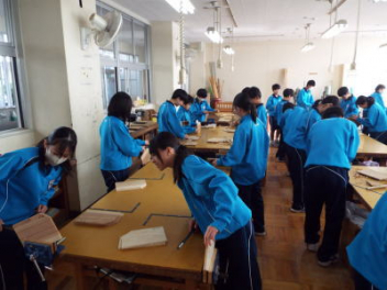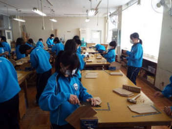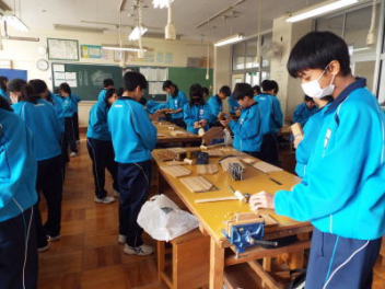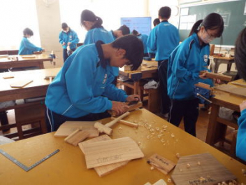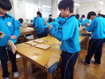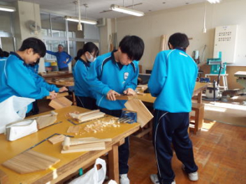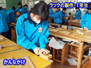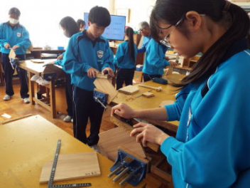 2時間目,木工室から「カンカン」「コンコン」という音が聞こえます。1年生が「ラックの製作」で「かんながけ」に取り組んでいます。生徒たちは前時までに木材を切り出していて,今日は線に合わせるように「かんな」で削っています。木槌で「かんな身」や「台がしら」をたたいて,刃先の微調整をしています。1mmを目指しての調整なので,生徒たちは真剣な表情で刃先を見ています。調整後に試しに削ってみて感触や音を確かめています。なかなか思うようにはいかないようですが,生徒たちは削った面を触りながら楽しそうに取り組んでいます。