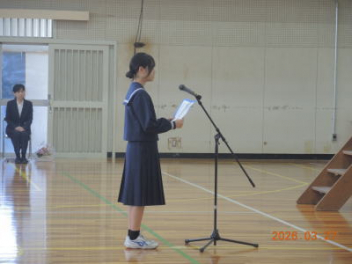 証書の授与の次は,「校長式辞」「PTA会長祝辞」「祝電披露」「送辞」「答辞」と続き,最後に2年生も加わっての「卒業式歌」です。卒業生と在校生との見事な歌声でした。