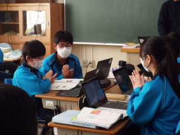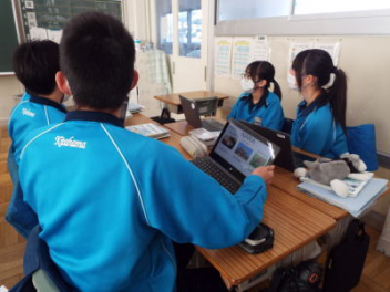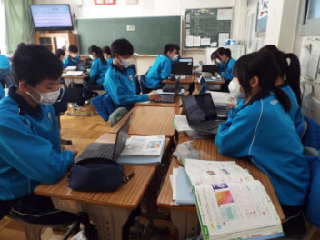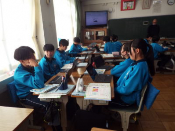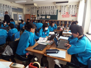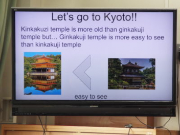 「Kinkakuzi temple is more old than ginkakuzi temple.・・・」と,班の代表の生徒が発表しています。2年生が,外国語の授業で,「比較級と最上級」の学習に取り組んでいます。今日は,「比較級,最上級」を使って文章を考える授業です。その文章を考える素材は,楽しみにしている「修学旅行」で調べている内容です。生徒たちは,修学旅行で訪れる予定の神社仏閣や観光地の写真などを使って英文を完成させています。授業の最後には,各班の代表がポスターを発表していました。各教科とのつながりが,生徒たちの心に残ると思います。