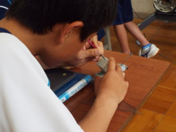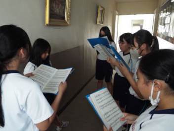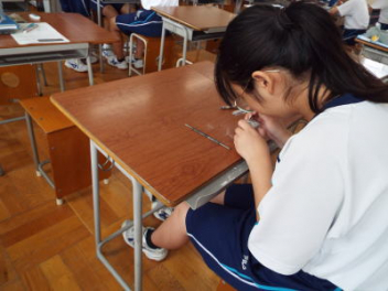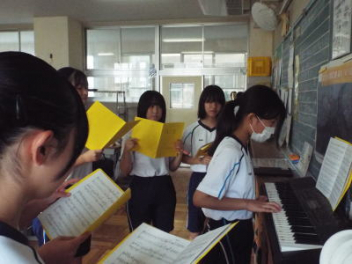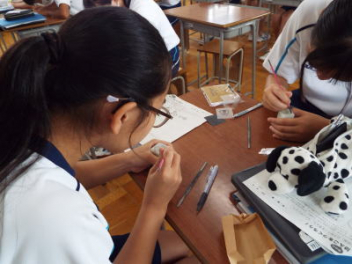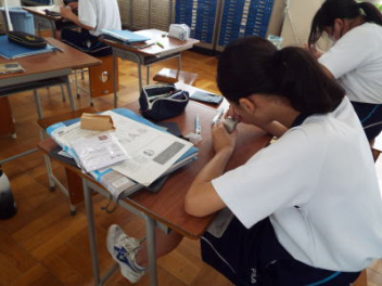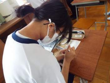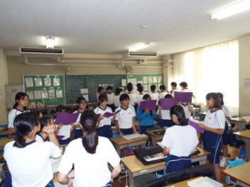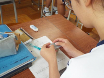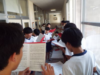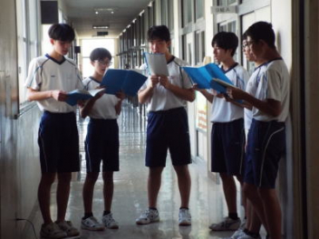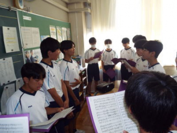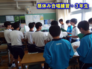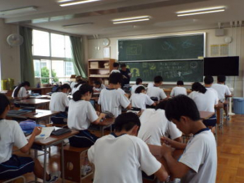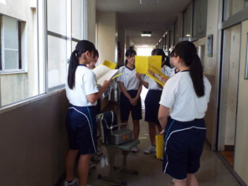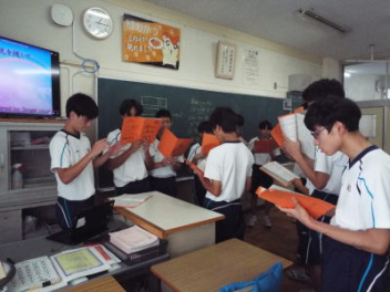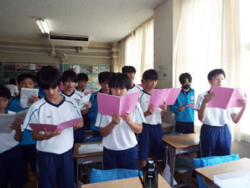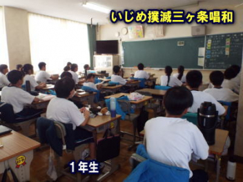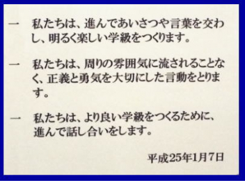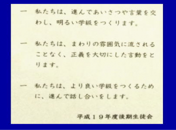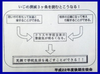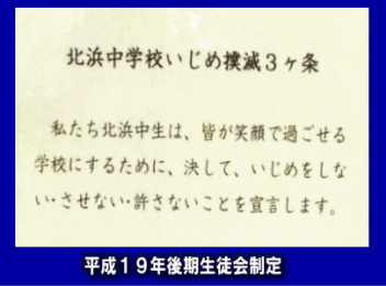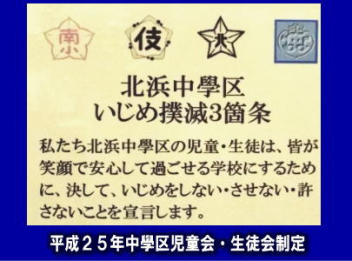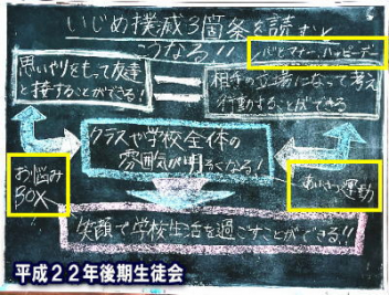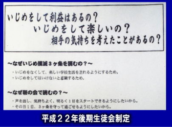 「生徒会からです。今日は『7』のつく日なので,朝の会で『いじめ撲滅三ヶ条』を唱和してください。」という放送が入りました。私たちの中学校区では,この三ヶ条をクラス全員で唱和をしています。この三ヶ条は,平成19年後期の生徒会によって初めて制定され,平成22年後期の生徒会によって「深化」され,平成25年に中学校区の小中学校の児童会・生徒会で話し合われて現在の形になりました。今の生徒会室には,特に平成22年当時の生徒会の話し合いの様子が移動式の黒板に残されています。その黒板を見ると,現在の学校生活の基本になっている「心とマナー」「ハッピーデー」「お悩みボックス」「あいさつ運動」が確実に位置づけられています。また,唱和する理由についても生徒会で話し合った結果が記されています。本校の大切な宝物です。