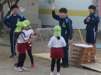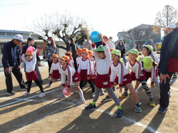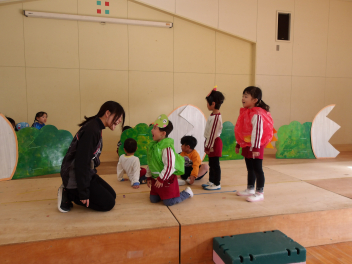 年中ひまわり組さんは元気のよいお兄さんやお姉さんと踊ったり、ゲームをしたり…。