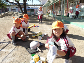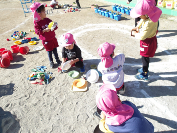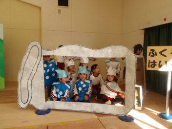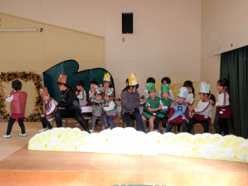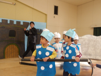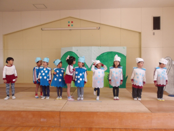 発表会ごっこをして遊んでいます他の学年の劇をやることができるため、憧れの年長さんの劇や楽器をやらせてもらったり、可愛い年中、年少の劇をやらせてもらったりしています。