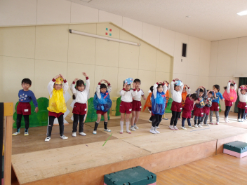 生活発表会の本番が終わった後、みんなで発表会ごっこをして楽しんでいる北浜中央幼稚園のこどもたちです